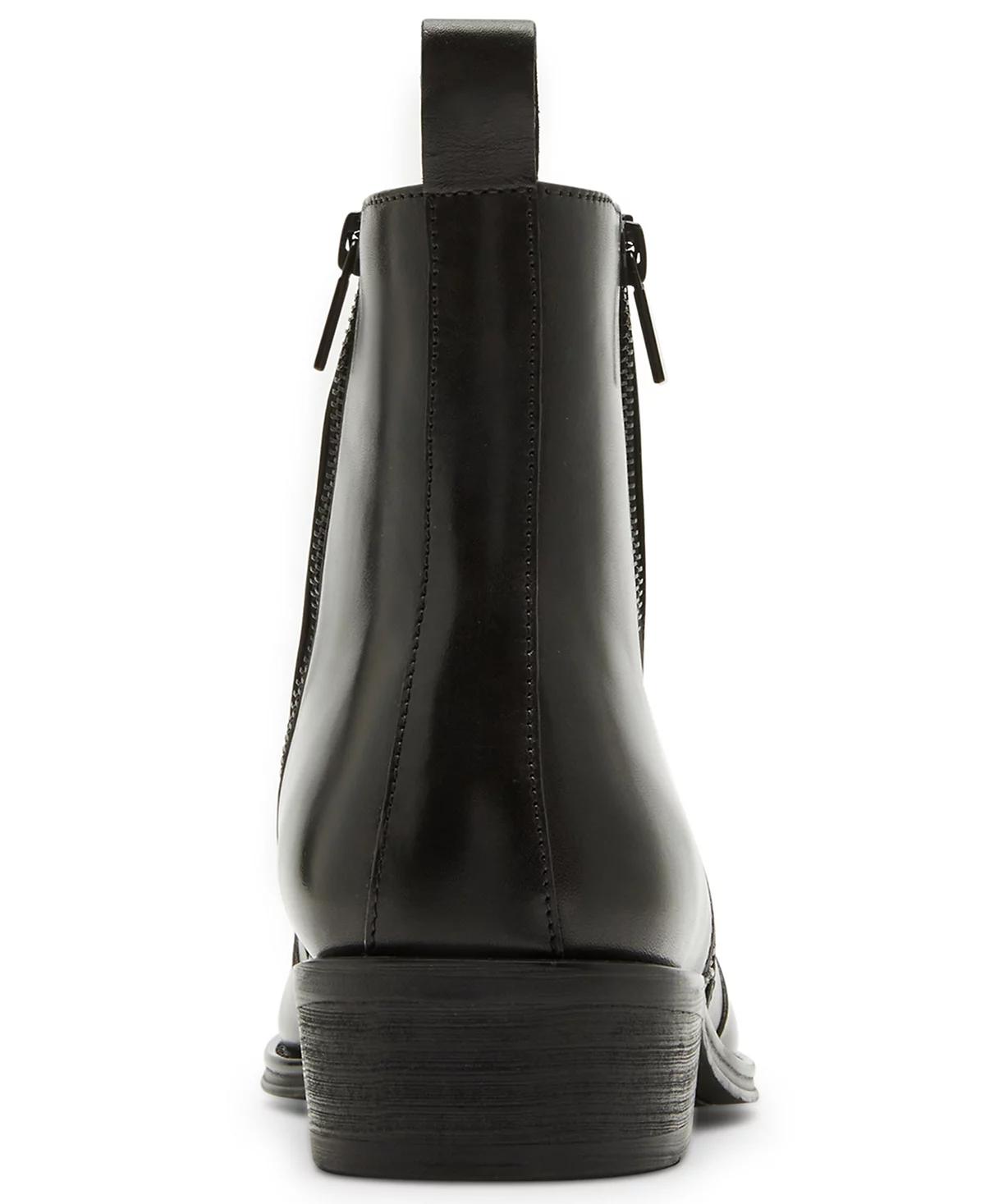 Sleek, modern, and polished. A double zipper design, a block heel, and a smooth front give Steve Madden's Hyphen dress boots their clean look and sharp, defined silhouette.