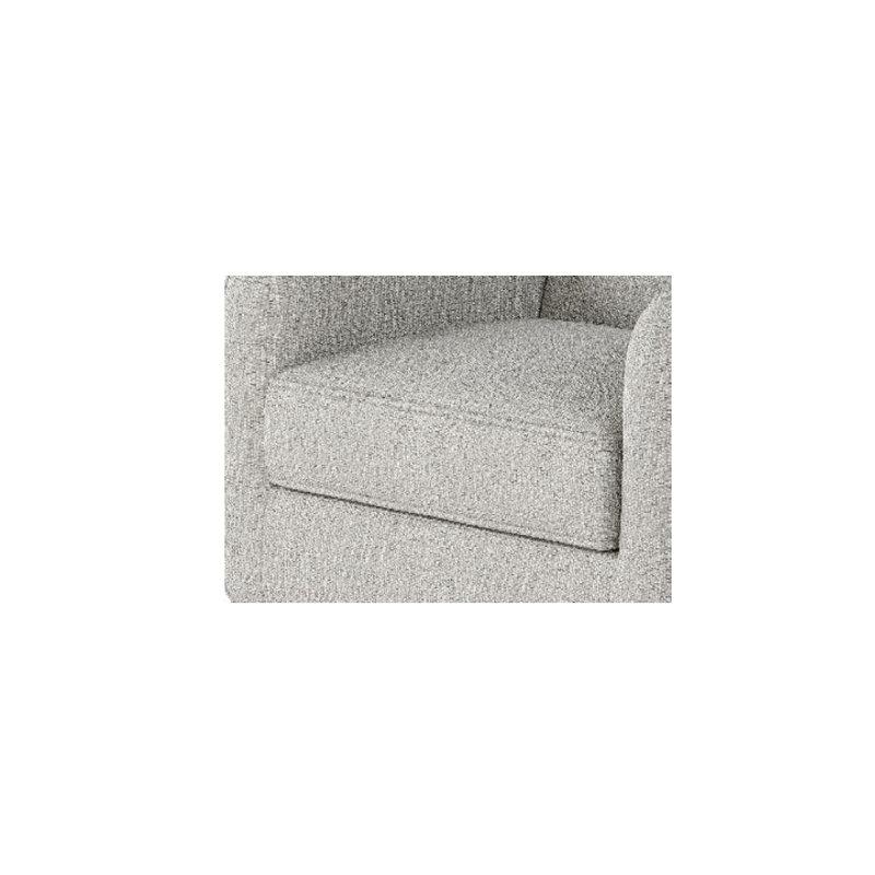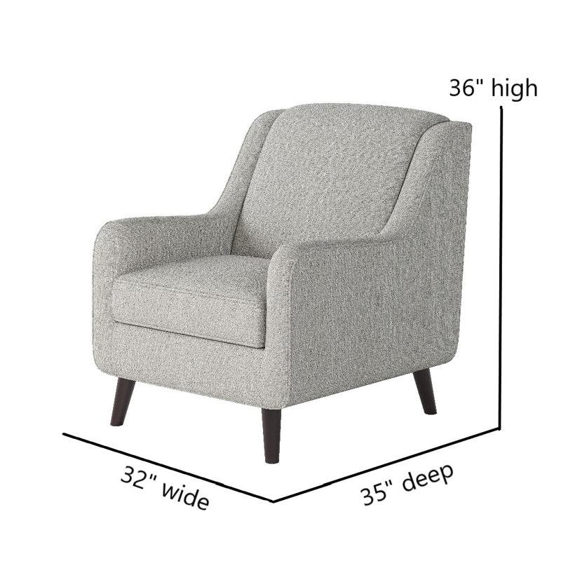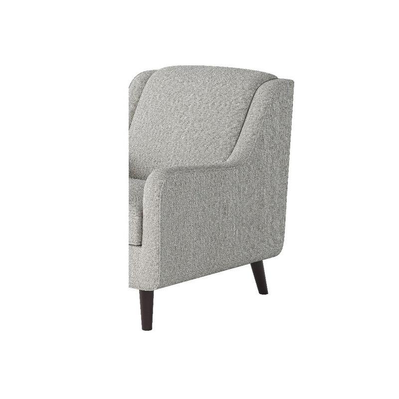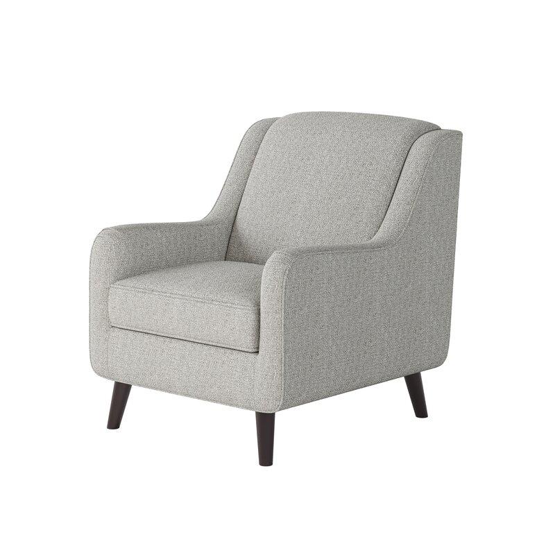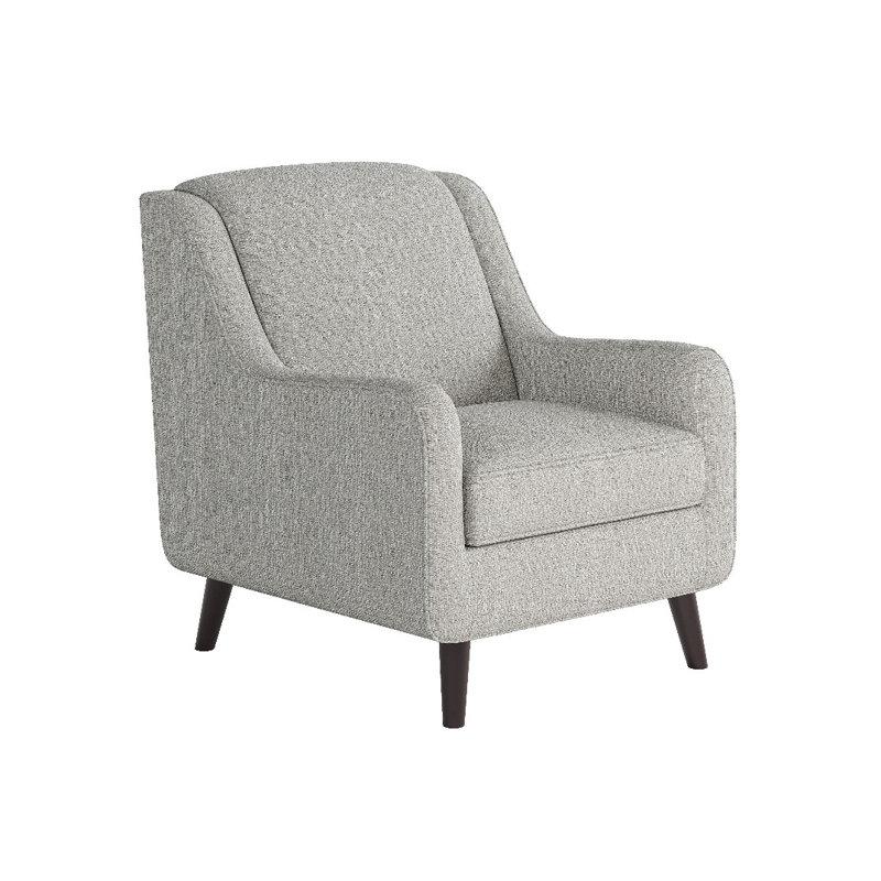 This armchair lends extra seating and a youthful style to your space. Crafted in the USA, the frame is made from solid and engineered wood and it has tapered, flared, coffee-hued solid wood legs. We love the modern yet traditional combination of the sloped arms, outside welting, tight back, and box border seat cushion. This chair is wrapped in polyester upholstery and boasts a stain-resistant design that's ideal for homes with pets or kids. The seat is filled with fiber-wrapped foam, and sinuous springs support you as you relax. Plus, its cushions are removable, so it's a cinch to vacuum up any crumbs. No assembly is required, so you can enjoy your chair right away. Due to lighting and monitor differences, actual colors and finishes may vary slightly from what appears online. Due to lighting and monitor differences, actual colors and finishes may vary slightly from what appears online.