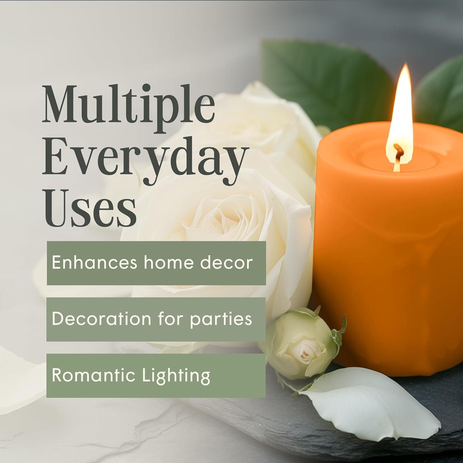 Sophisticated Design: Featuring a sleek, solid color, these 3x4 inch Orange pillar candles enhance any decor with their timeless elegance; Mister Candle Unscented Orange Candles easily add a refined touch to any space without saturating it. Versatile Aesthetic: The sober design with clean lines of these unscented Orange candles make them a versatile choice for any occasion; Whether used as elegant centerpieces or subtle accents, each pillar candle effortlessly complements any color scheme or decor style. Extended Burn Time: With an impressive 60-hour burn time, these candles provide long-lasting illumination; Our plain Orange pillar candles are Ideal for extended gatherings or cozy evenings, their slow and even burn allows you to enjoy their soft, steady light for hours on end. Maximized Purity: Free from added fragrances, our candles let you enjoy their gentle, flickering light without distraction; Featuring lead-free cotton wicks, each pillar candle offers a clean, smokeless burn, perfect for creating a serene and welcoming atmosphere. High-Quality: Mister Candle's hand-poured Orange pillar candles reflect high standards of craftsmanship and quality; Support local artisans and experience the superior performance. Disclosure: We are a participant in the Amazon Services LLC Associates Program, an affiliate advertising program designed to provide a means for us to earn fees by linking to Amazon.com and Affiliate sites.