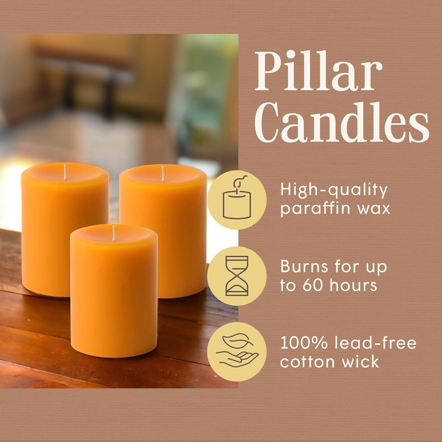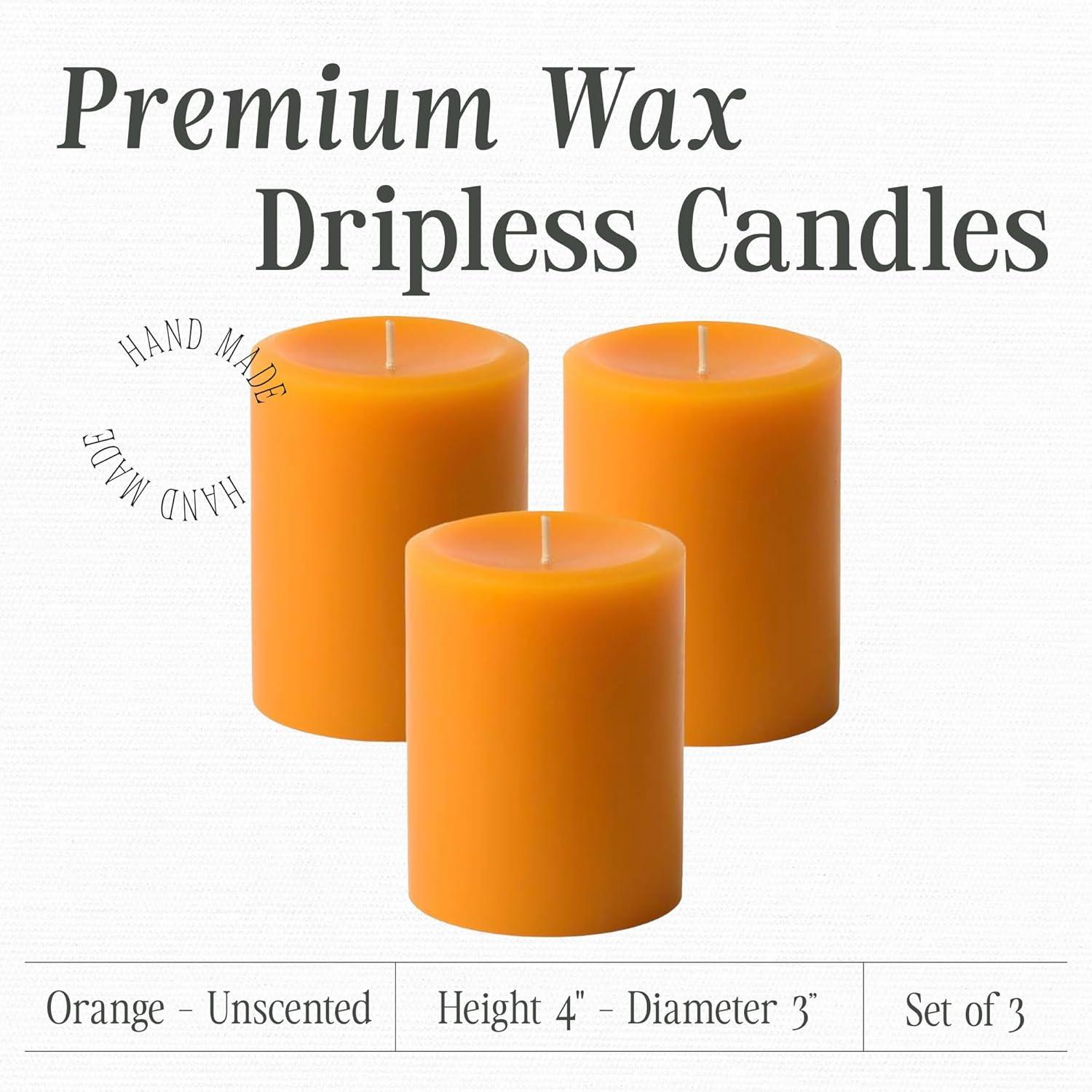 Mister Candle Dripless Unscented Orange Pillar Candles, Set of 3 Hand Poured Solid Color Non-Scented Candles for Home Decor, Premium Wax, 60 Hr Burn Time - 3x4 Inch, Orange