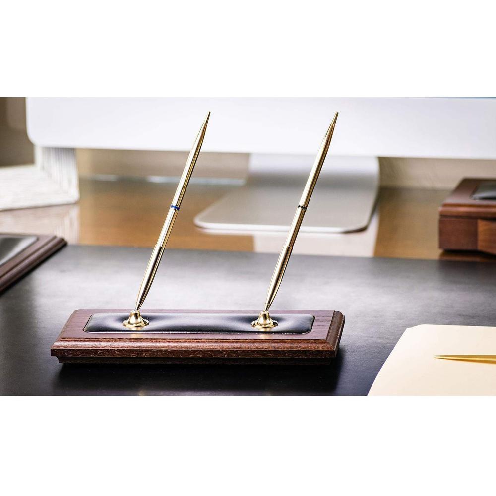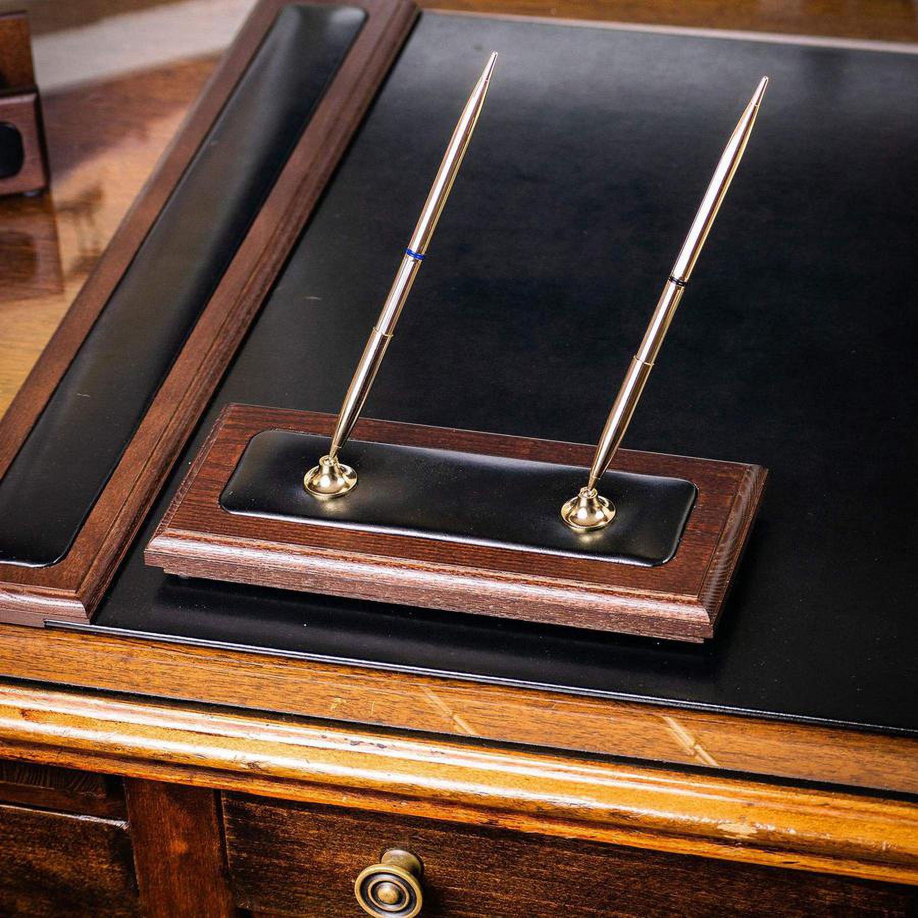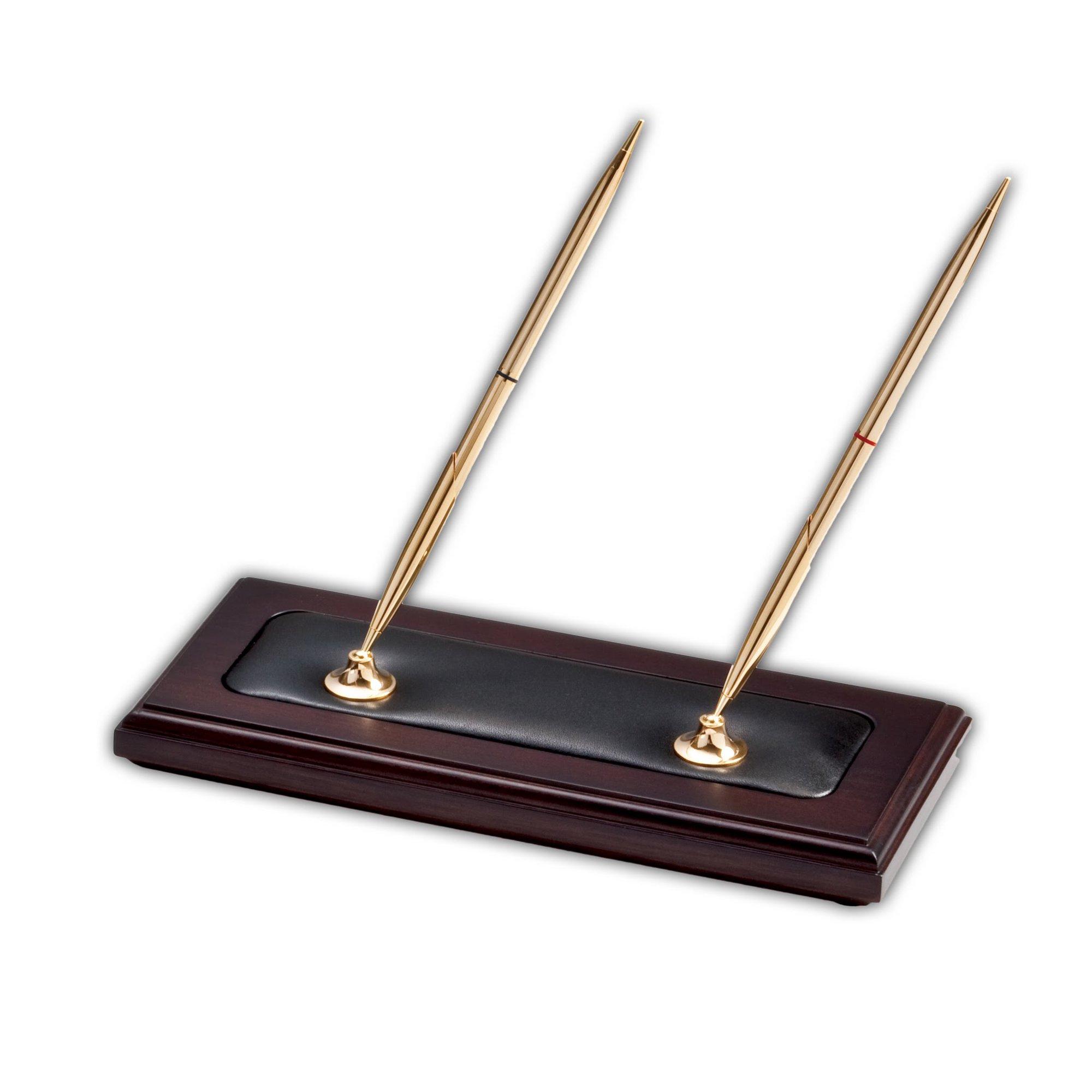 A classy addition to any desktop or workspace, this double pen stand will add function and sophistication to your office! Built with a top-grain leather inlay and wood base, this piece is designed to last for years and keep your desk surface safe from scratches.