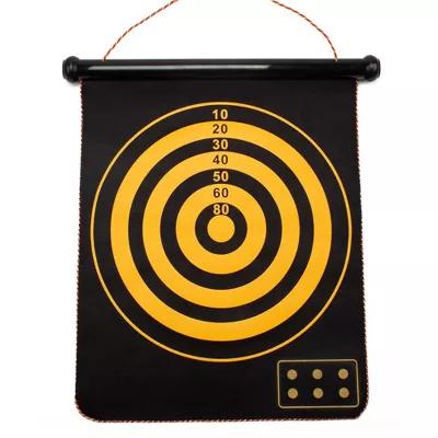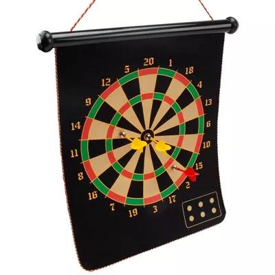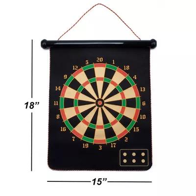The 2-in-1 magnetic dart board game set includes a magnetic dartboard measuring 18-inches high and 15-inches wide, and 6 safety magnetic darts (3 yellow / 3 red). The dartboard can be easily rolled and unrolled to hang anywhere you want with the lanyard, and the magnetic darts will stick and not fall off, safe and easy to use. Adults and kids will equally enjoy the traditional dartboard game with our reversible magnetic dartboard no matter your age or skill level, safety indoor/outdoor games.