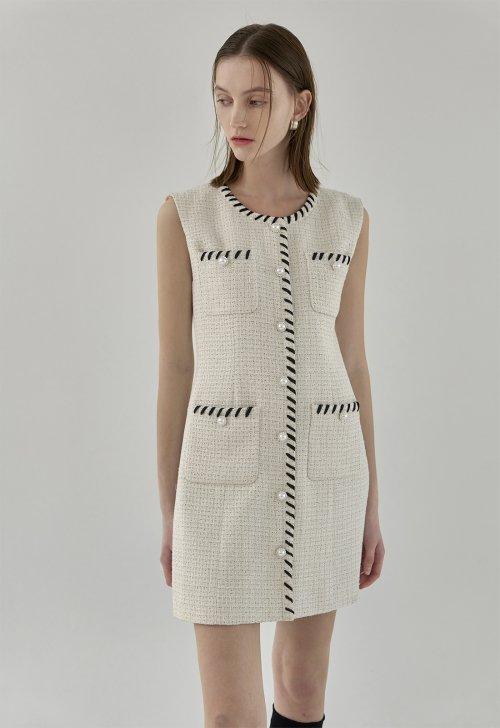 Composition : Outer: 77% polyester, 10% rayon, 10% cotton, 3% nylon, lining: 100% polyester. Stretch : No stretch. Thickness : Medium thick. See-through level : Non see-through. Texture : Moderate touch .Sleeve length : Sleeveless. Color : White,Black. Country of origin : China.