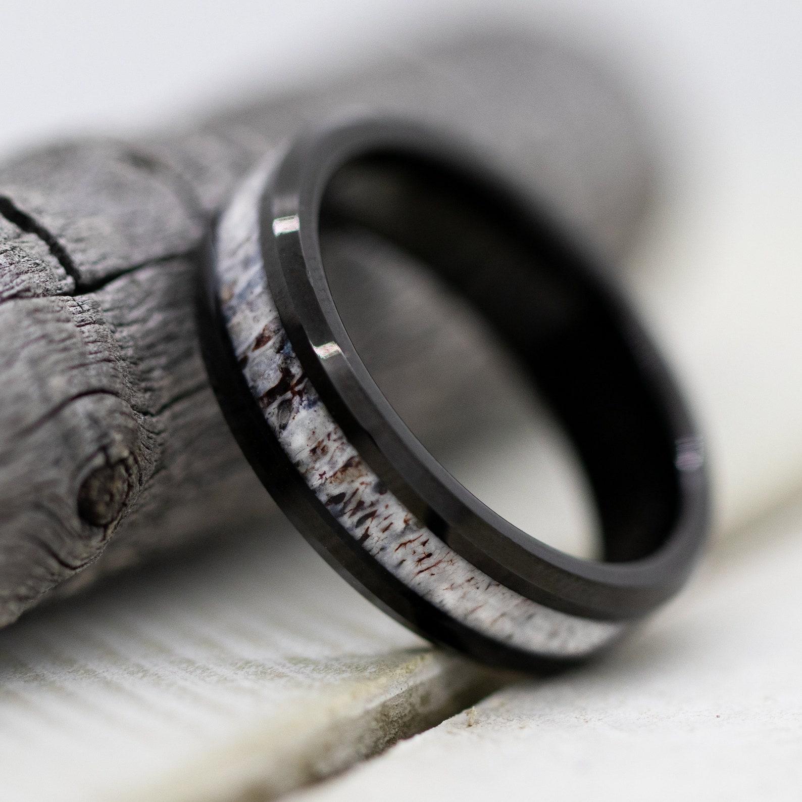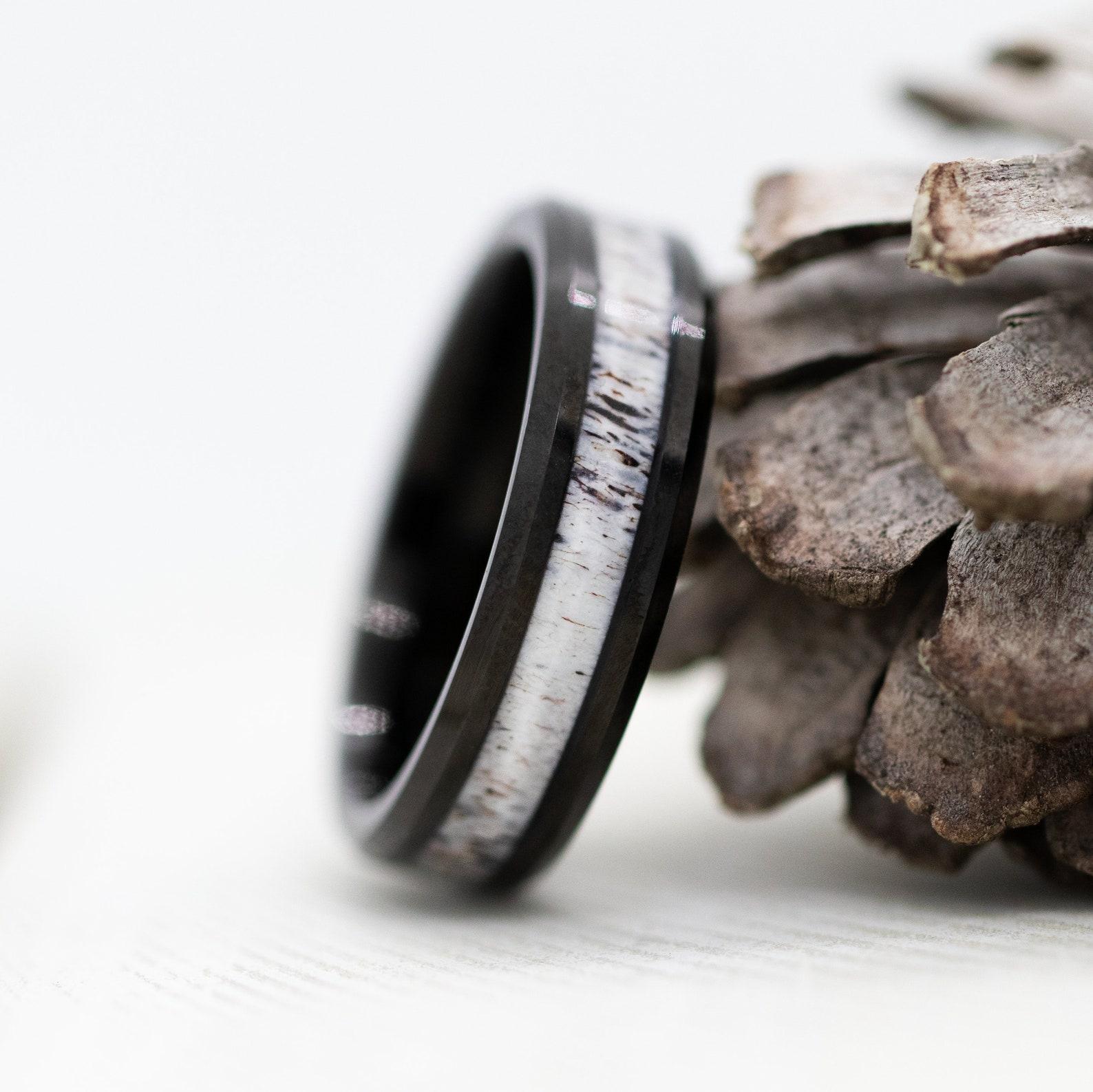 Natural deer antler color varies slightly on each ring All deer antler is sourced from natural shedding. No animals are harmed in the making of these rings. We only use premium quality tungsten for our rings. Tungsten in its natural color is a grey color so we use a process called ion plating to achieve the glossy colored finish. All of our bands are the "comfort fit" style. The purpose of the comfort fit (rounded interior) is so they slide on & off your finger with ease, don't pinch, & have more of a luxurious feel to them. Comfort fit wedding bands are the most preferred style of wedding bands. Tungsten will not turn your fingers green.