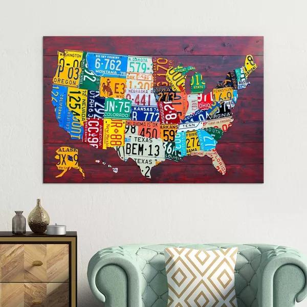 Add a dynamic piece finished in exceptional detail to your space with the License Plate Map USA from David Bowman. Produced with a finish that offers the texture, look and feel of fine-art paintings, this artwork has been colored with fade-resistant archival inks to guarantee perfect color reproduction that remains vibrant for decades even when exposed to light.