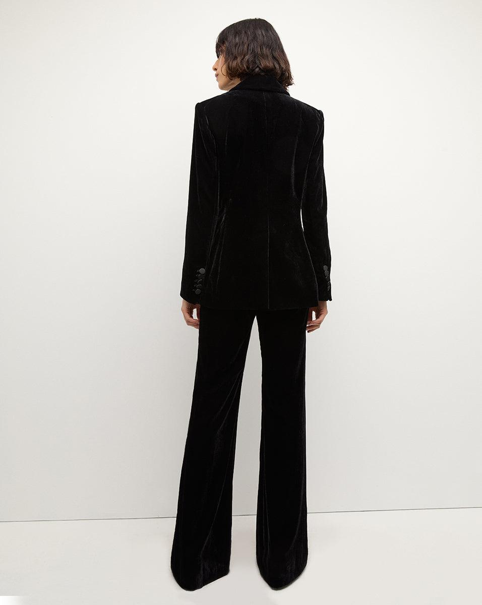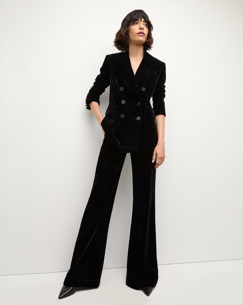 A statement jacket, in luxurious velvet. Expertly tailored for an elongated, relaxed fit, the Ellette drapes beautifully on the body and is finished with satin buttons and a peak lapel. Whether worn with dresses or jeans or paired with the matching velvet pant, this makes for a memorable evening look.